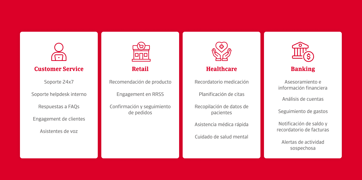 Pensemos en diferentes escenarios y en diferentes industrias, y veamos algunos ejemplos de casos de uso para las Chatbot APIs. En la tabla que se muestra a continuación se ejemplifican algunos casos de uso por sectores: