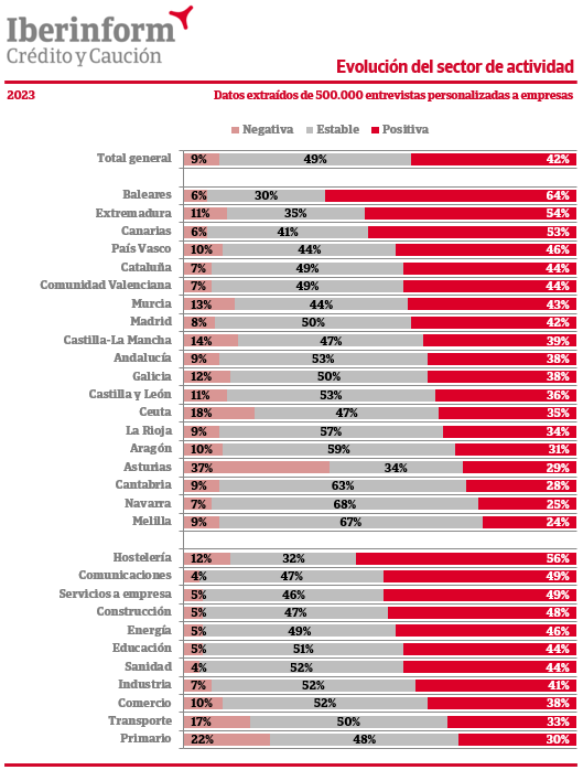 En todas las Comunidades Autónomas salvo Asturias el porcentaje de empresas que prevén una evolución positiva de la actividad sectorial supera al de aquellas que trabajan con escenarios de caída. Los porcentajes más elevados de empresas que trabajan con escenarios de crecimiento sectorial se dan en Baleares (64%), Extremadura (54%), Canarias (53%) y País Vasco (46%). Los porcentajes caen sensiblemente en Melilla (24%), Navarra (25%), Cantabria (28%) o Asturias (29%). La mayor tasa de empresas con una previsión negativa de su desempeño sectorial se registra en Asturias (37%).