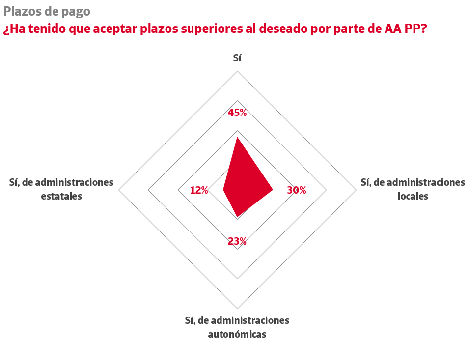 Aunque en menor medida, las Administraciones también forman parte del problema de la extensión indeseada de los plazos de pago: el 45% de las empresas que trabaja con el sector público tiene que aceptar plazos superiores a los deseados. El peor comportamiento, que afecta al 30% de las compañías, se da entre las Administraciones locales. Este porcentaje se reduce al 23% con las Administraciones autonómicas y al 12% con las estatales.