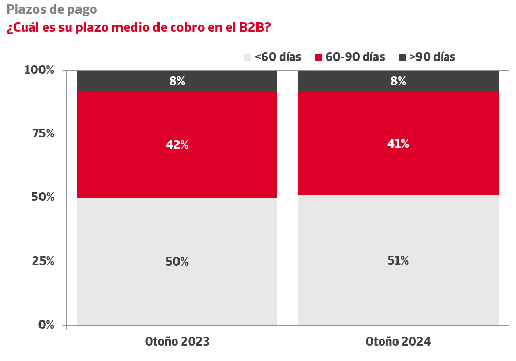 Solo el 51% de las empresas trabaja con plazos de cobro inferiores a los 60 días fijados por la Ley 15/2010 de Medidas de Lucha contra la Morosidad. El dato representa, sin embargo, una mejora de un punto porcentual respecto a los valores de hace un año, mejorando el comportamiento en plazos a los niveles pre Covid-19, cuando un 49% de las firmas trabajaba por debajo de los 60 días.