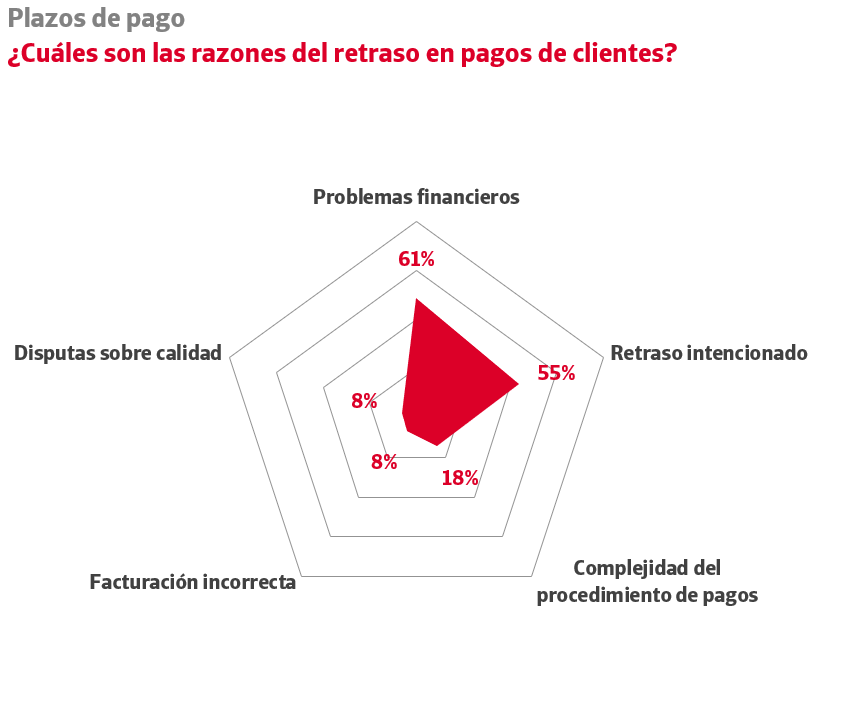 Al abordar las razones que explican la morosidad empresarial, la oleada de otoño, refleja una gran incidencia de la falta de disponibilidad de fondos por parte de los clientes. Los problemas financieros constituyen la razón más citada (61% de las empresas), por delante del retraso intencionado de los clientes (55%), la complejidad del procedimiento de pagos (18%), las disputas sobre la calidad de los bienes y servicios suministrados (8%) o la emisión de facturas incorrectas (8%).