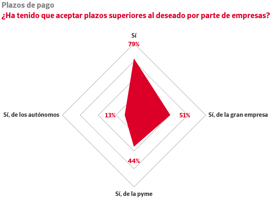De acuerdo con el trabajo de campo, en el que han participado cerca de 600 gestores de empresas de todos los tamaños y sectores, el 51% del tejido productivo tiene que aceptar plazos de pago superiores a los deseados por parte de la gran empresa y el 44% por parte de las pymes. La capacidad de los autónomos para imponer plazos de pago solo afecta al 13% de las entidades.