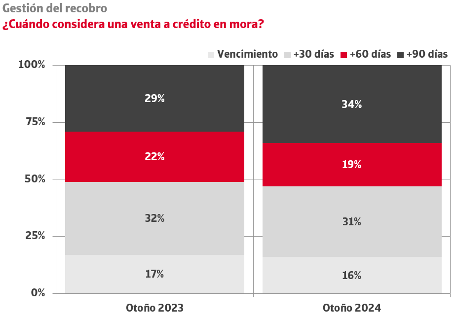 El tiempo es el mayor enemigo de la eficacia en la recuperación de deudas. Sin embargo, solo el 16% de las empresas españolas inicia acciones de recobro al vencimiento de la factura, de acuerdo con los datos recogidos en la oleada de otoño del Estudio de la Gestión del Riesgo de Crédito en España que impulsan Crédito y Caución e Iberinform en el que han participado los gestores de cerca de 600 empresas de todos los tamaños y sectores. Para preservar sus relaciones comerciales, la mayoría de las firmas españolas concede a sus clientes plazos adicionales a los inicialmente pactados. Aquellas que otorgan a sus clientes plazos adicionales superiores a los 90 días antes de poner en marcha acciones de recobro han crecido cinco puntos porcentuales, hasta un significativo 34%.