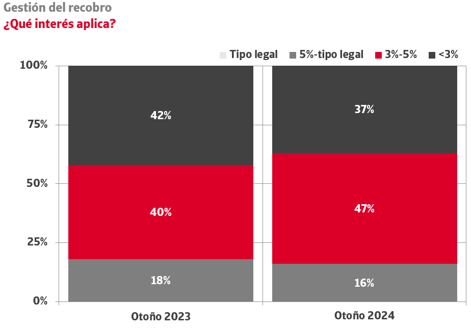 En un contexto de endurecimiento de la política monetaria, el tipo legal de interés de demora aplicable a las operaciones comerciales se sitúa en el 12,25%. Sin embargo, entre quienes aplican intereses de demora, el 84% de las empresas reclama por debajo del 5%. El porcentaje de empresas que reclama el tipo de interés que marca la ley en defecto de pacto ni siquiera alcanza el 1%.