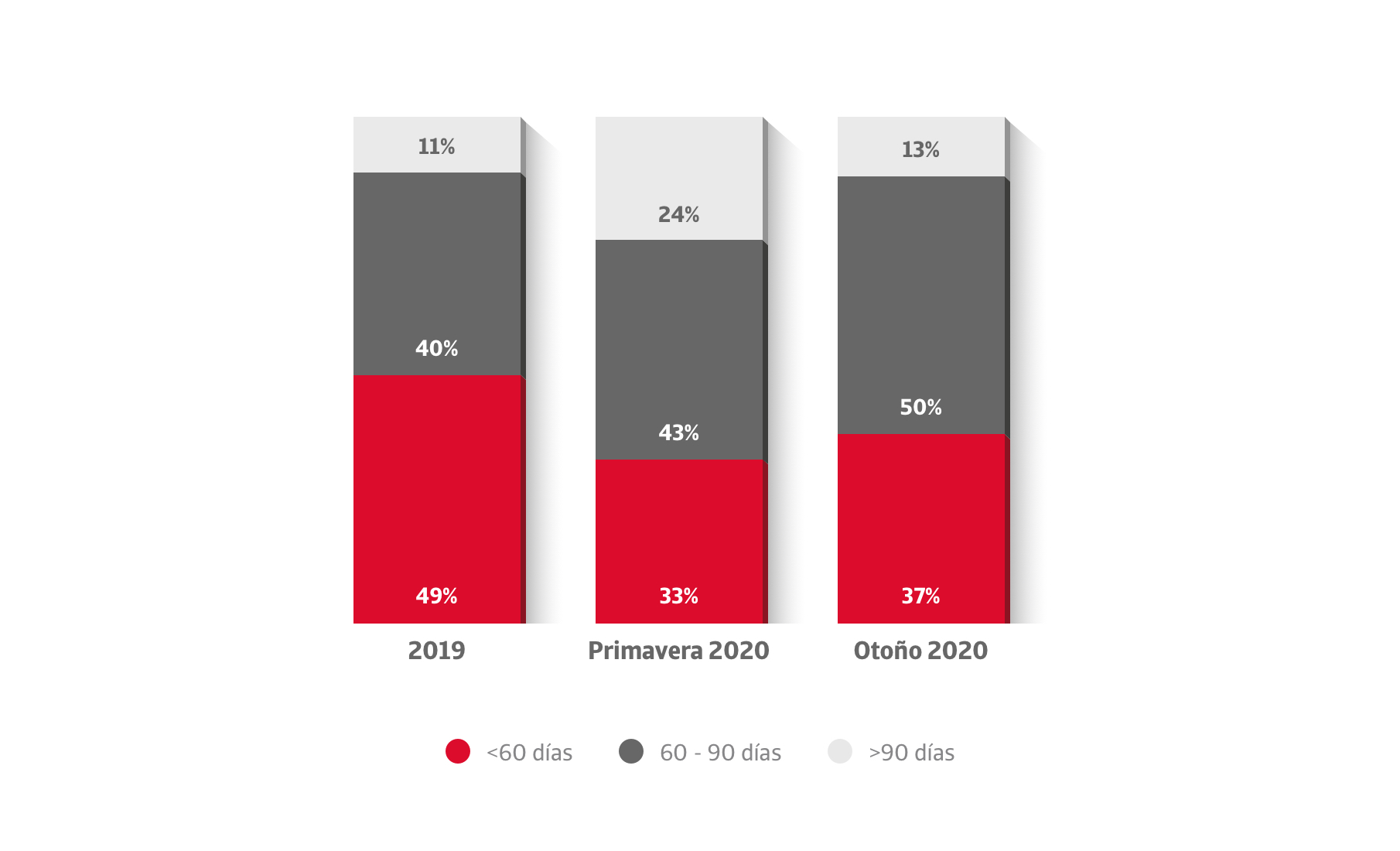 De acuerdo con la oleada de otoño del Estudio de la Gestión del Riesgo de Crédito en España, que impulsan Crédito y Caución e Iberinform, la pandemia ha reducido notablemente el porcentaje de empresas que opera dentro de los plazos que fijó la Ley 15/2010 de Medidas de Lucha contra la Morosidad. En 2019, prácticamente la mitad del tejido empresarial trabajaba por debajo de los 60 días, pero las tensiones económicas provocadas por el Covid-19 han modificado sensiblemente esta realidad. Solo el 37% de las empresas opera con plazos medios inferiores a los 60 días, un porcentaje que apenas cambia en tres puntos frente a la oleada de primavera. La única mejora sensible de la oleada de otoño se refleja en el tramo por encima de los 90 días, donde los valores vuelven a acercarse a la situación anterior al Covid-19.