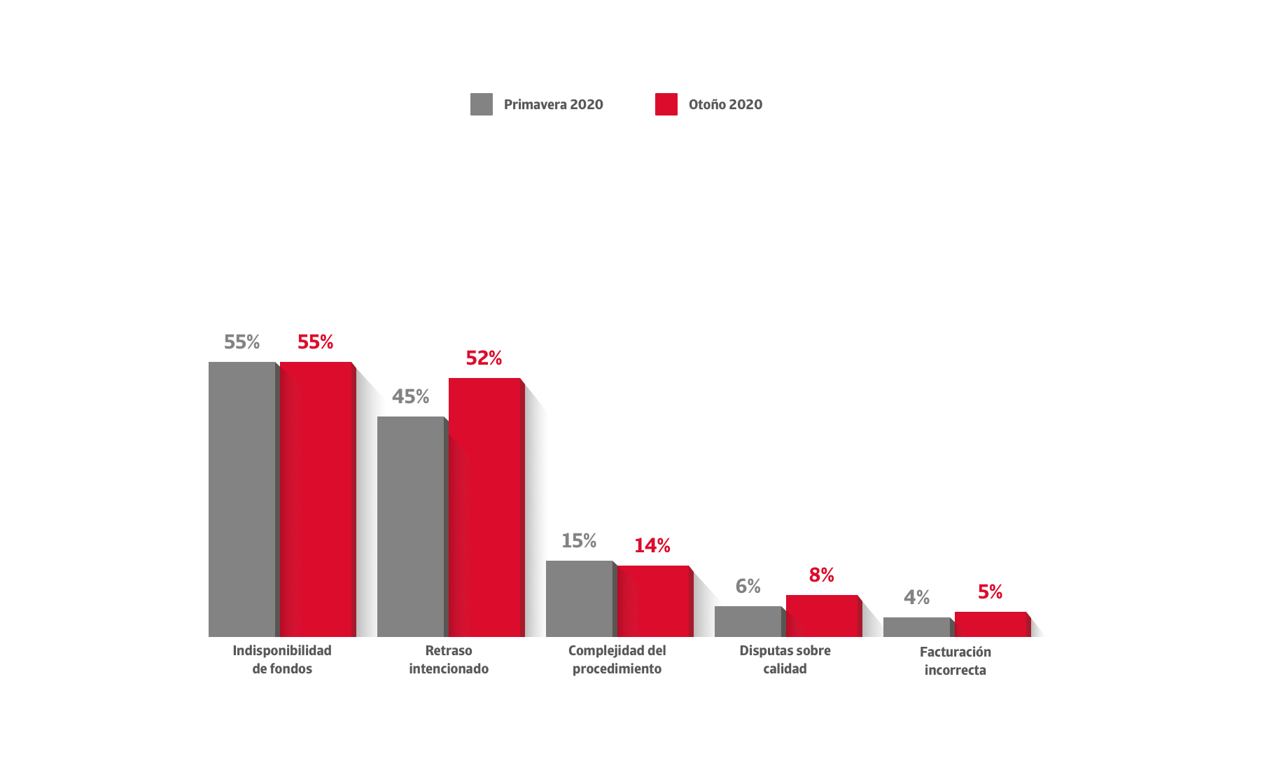 Al abordar las razones que explican la morosidad empresarial, la oleada de otoño refleja un crecimiento significativo de siete puntos de los retrasos intencionados por parte de los clientes, en un contexto de incertidumbre, las empresas han optado por proteger su caja. No obstante, en las dos oleadas de 2020 la falta de disponibilidad de fondos constituye la razón más citada, por delante del retraso intencionado de los clientes, la complejidad del procedimiento de pagos, las disputas sobre la calidad de los bienes y servicios suministrados o la emisión de facturas incorrectas.