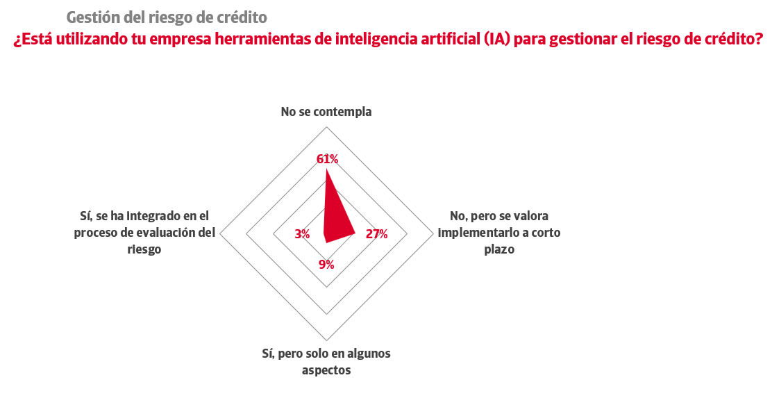 La Inteligencia Artificial permite procesar grandes volúmenes de datos históricos y en tiempo real para anticipar escenarios financieros como caídas de ingresos o impagos, ayudando a anticipar, mitigar y responder de forma más ágil a los desafíos económicos. Sin embargo, el Estudio de Gestión del Riesgo de la oleada de otoño refleja la reticencia de las empresas a incorporar herramientas de IA en la gestión del riesgo de crédito ya que sólo el 3% de las casi 800 empresas consultadas asegura haberlo incorporado en los procesos de evaluación. Un 27% de las entidades empresariales señala su intención de emplear la IA en el corto plazo mientras que el 61% no considera el uso de esta tecnología en la gestión del riesgo crediticio.