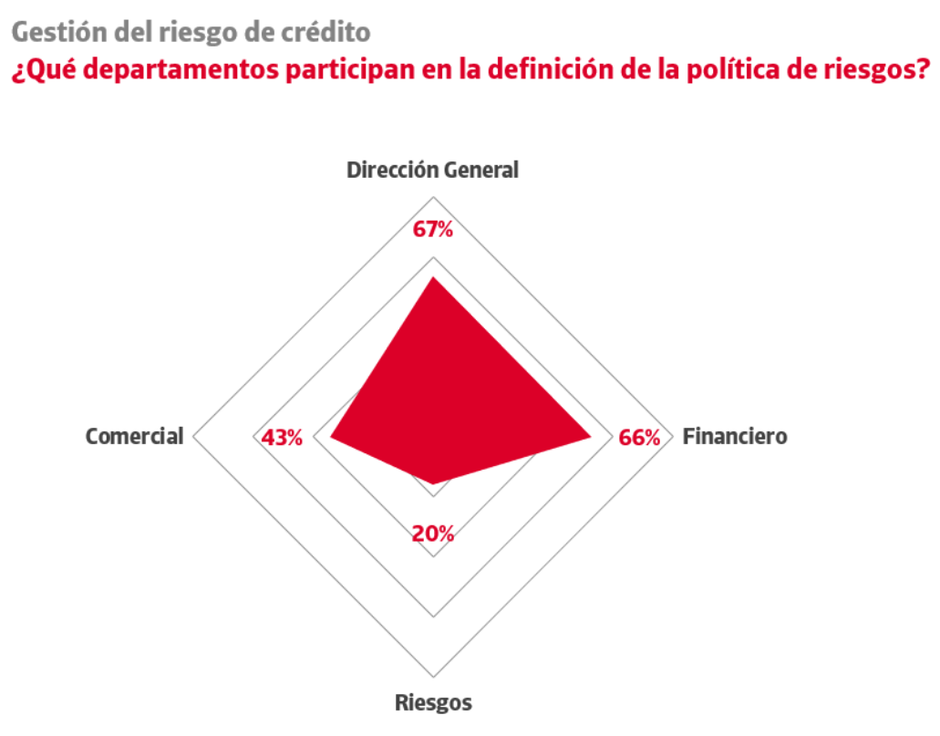 El control del riesgo de crédito a lo largo del ciclo económico implica un equilibrio inestable entre las áreas más técnicas de la empresa y los departamentos comerciales enfocados al crecimiento. Los departamentos financieros participan en la definición de la política de riesgos en el 66% de las empresas, por encima del 43% en las que tienen peso las áreas comerciales. La dirección general juega un papel de arbitraje en el 67% de las empresas y solo un 20% se ha dotado de departamentos especializados de riesgos de acuerdo con la oleada de otoño del Estudio de la Gestión del Riesgo de Crédito en España, que impulsan Crédito y Caución e Iberinform, en el que han participado los gestores de cerca de 600 entidades de todos los tamaños y sectores.
