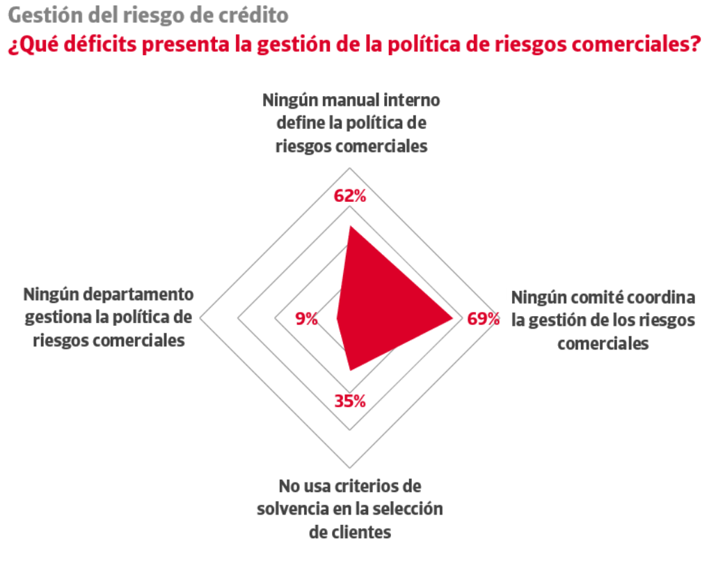 El 62% de las compañías no cuenta con procedimientos estructurados que definan por escrito su política de riesgos comerciales y, quizás el dato más preocupante, el 9% de las empresas no aplica ningún tipo de política de riesgos para gestionar los posibles impagos en sus procesos de prospección.