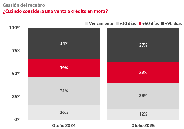 El retraso en las acciones de recobro implica un deterioro en la efectividad de la recuperación. A pesar de ello, el estudio refleja una gran flexibilidad de los plazos de recobro, como medida para salvaguardar las relaciones comerciales. El 37% de las empresas permite a sus clientes retrasos en pagos de más de 90 días antes de considerar un crédito moroso.