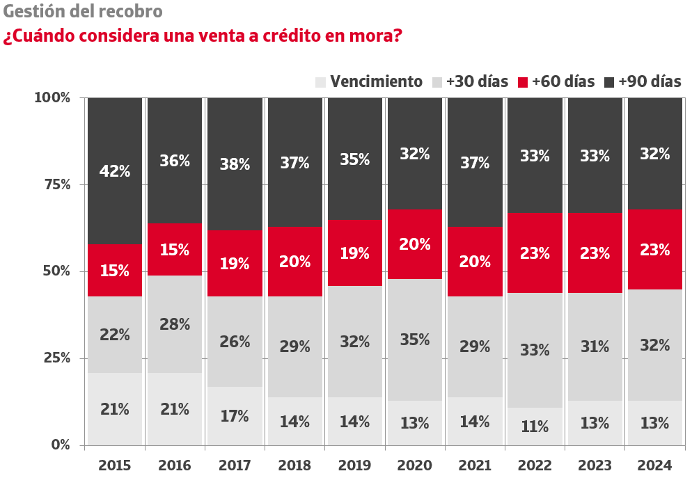 El retraso en las acciones de recobro implica un deterioro en la efectividad de la recuperación. A pesar de ello, el estudio refleja una gran flexibilidad de los plazos de recobro, como parte de la relación comercial. El 32% de las empresas permite a sus clientes retrasos en pagos de más de 90 días antes de considerar un crédito moroso.