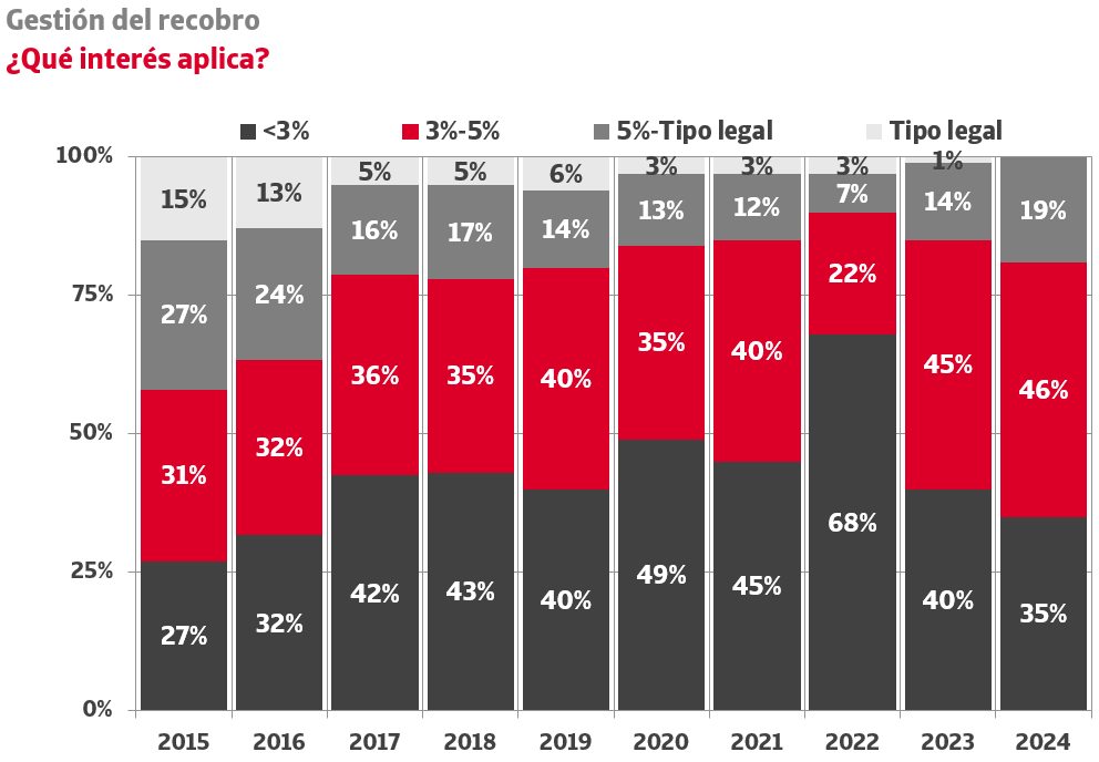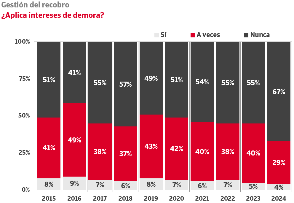 Cuando se inician las acciones de recobro, la inmensa mayoría de las empresas renuncia al cobro de intereses de demora. El 67% de las empresas, el porcentaje más elevado de la serie histórica, no los aplica nunca y solo el 4% es sistemático a la hora de ejercer su derecho. El endurecimiento de la política monetaria por parte del Banco Central Europeo ha provocado que los tipos de interés de demora para operaciones comerciales, que entre 2016 y 2022 estuvieron fijados en el 8%, registrasen un incremento hasta el 12,5% en el primer semestre de 2024. La subida de este indicador oficial no tiene, sin embargo, traslación a la economía real: según el Estudio elaborado por Crédito y Caución e Iberinform, prácticamente el 100% de las empresas que aplican intereses de demora reclaman por debajo de los que le corresponden legalmente.