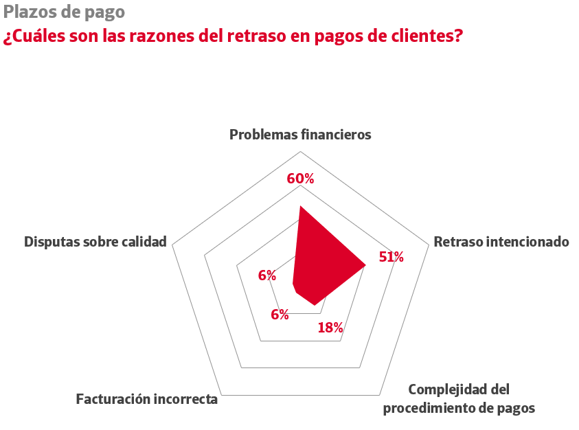 Un 60% de las empresas percibe problemas financieros en sus clientes, un punto porcentual más que hace un año. Esta falta de liquidez vuelve a ser la razón más citada para explicar la morosidad empresarial, por delante del retraso intencionado (51%), la complejidad del procedimiento de pagos (18%), la emisión de facturas incorrectas (6%) o las disputas sobre la calidad de los bienes y servicios suministrados (6%).