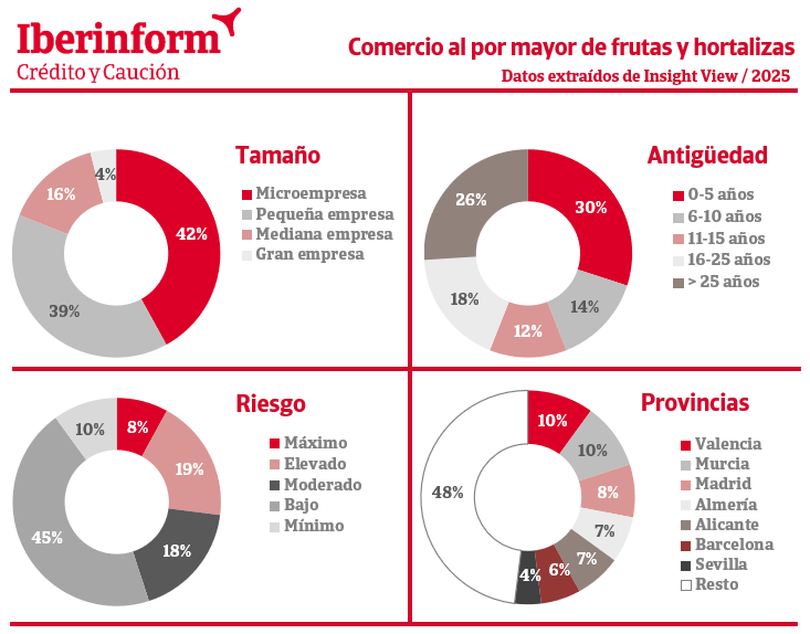 De acuerdo con los datos que ofrece Insight View, los mayoristas de frutas y verduras se concentran en las provincias de Valencia y Murcia (10%), seguidas de Madrid (8%), Almería (7%), Alicante (7%) y Barcelona (6%). Teniendo en cuenta los territorios cuyo peso representa al menos el 3% del sector, el ratio de empresas en riesgo máximo o elevado de incumplir sus pagos está por encima de la media en Madrid (36%), Málaga y Almería (34%), Castellón (32%), Barcelona (31%) y Sevilla (28%). Los mejores ratios se registran en Valencia (25%), Murcia, Alicante y Lérida (26%).