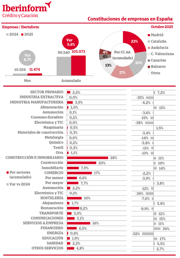 De acuerdo con el seguimiento de los registros mercantiles que realiza Iberinform, la constitución de nuevas empresas registró en octubre un aumento del 8,7% respecto al mismo mes del ejercicio anterior. En el conjunto del año la creación de tejido productivo acumula una subida del 5,6%. Las nuevas firmas se concentran en Madrid (23% del total), Cataluña (20%), Andalucía (17%) y la Comunidad Valenciana (13%). Por sectores de actividad, los mayores volúmenes de constituciones se encuentran en construcción e inmobiliario (28% del total), comercio (17%), servicios a empresa (16%) y hostelería (10%).