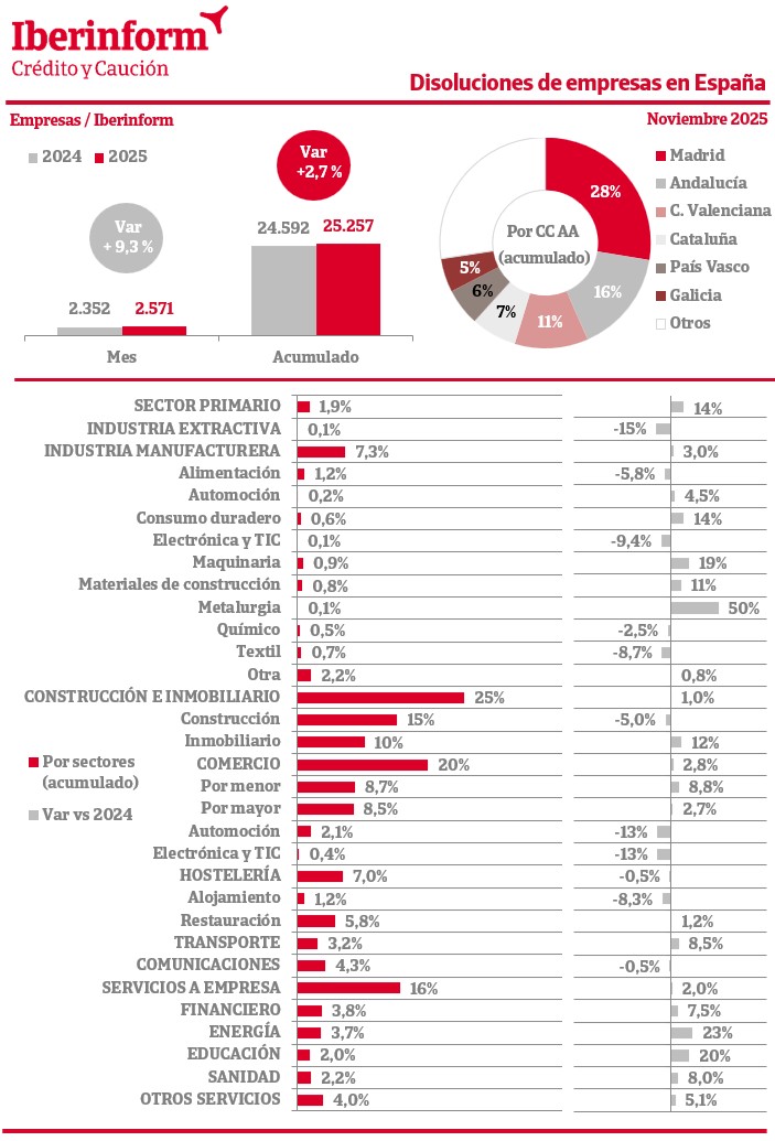 Los datos de noviembre muestran que la disolución de empresas registró un aumento del 9,3% respecto al mismo mes del ejercicio anterior. En el conjunto del año, registró una subida del 2,7%. La destrucción de tejido empresarial se concentra en Madrid (28% del total), Andalucía (16%), la Comunidad Valenciana (11%) y Cataluña (7%).