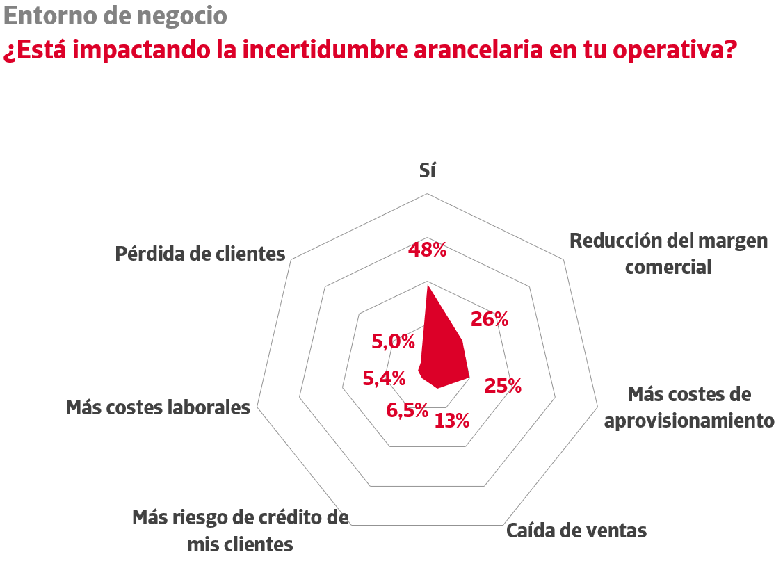 La incertidumbre en torno a la evolución de los aranceles afecta a una de cada dos empresas españolas. De acuerdo con el último Estudio de la Gestión del Riesgo de Crédito en España, que impulsan Crédito y Caución e Iberinform, el 26% prevé una reducción de sus márgenes comerciales. Además, un 25% espera que se incrementen sus costes de aprovisionamiento, un 13% una caída de las ventas, un 5,4% mayores costes laborales y un 5% pérdida de clientes. El 6,5% de las empresas espera que los mayores aranceles provoquen un deterioro del riesgo de crédito de su cartera comercial.