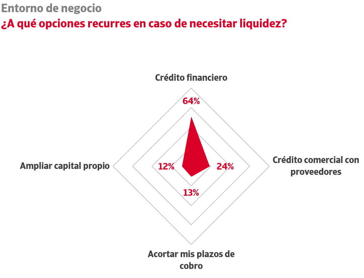 El crédito financiero es la principal fórmula utilizada por el tejido productivo (64% de las empresas) para cubrir sus necesidades de liquidez adicional. Un relevante 24% recurre también a ampliar el crédito comercial con sus proveedores. El 13% restringe el crédito comercial a sus clientes y un 12% acude a las ampliaciones de capital.