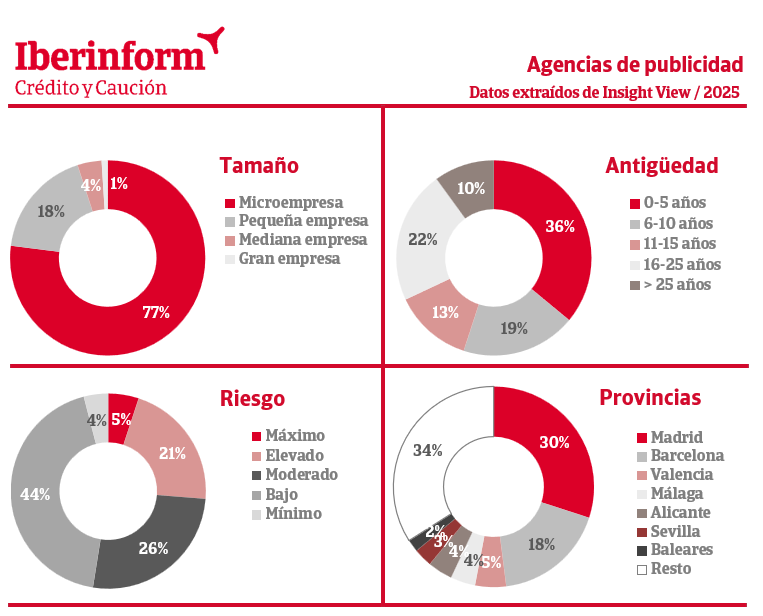 El sector de las agencias de publicidad, que crean, ejecutan y distribuyen las campañas publicitarias del tejido productivo, afronta un momento de transformación marcado por la omnicanalidad de la comunicación de las marcas, la conversación digital con los consumidores y las nuevas habilidades técnicas, analíticas y de marketing de datos. En este contexto de cambio, de acuerdo con los datos que ofrece Insight View, el 26% de las agencias de publicidad se encuentra en máximo o elevado riesgo de impago, un punto por encima de los niveles de 2024.