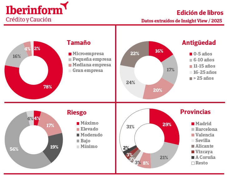 El 33% de las editoriales ha sido fundadas en la última década. Es en ese tramo donde se registra el peor comportamiento financiero: el alto riesgo de impago afecta al 30% de las empresas de este segmento. En las firmas entre los 10 y los 25 años de antigüedad este ratio se sitúa en el 15% y vuelve a elevarse hasta el 21% entre las de más de 25 años.