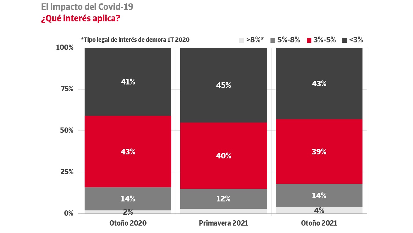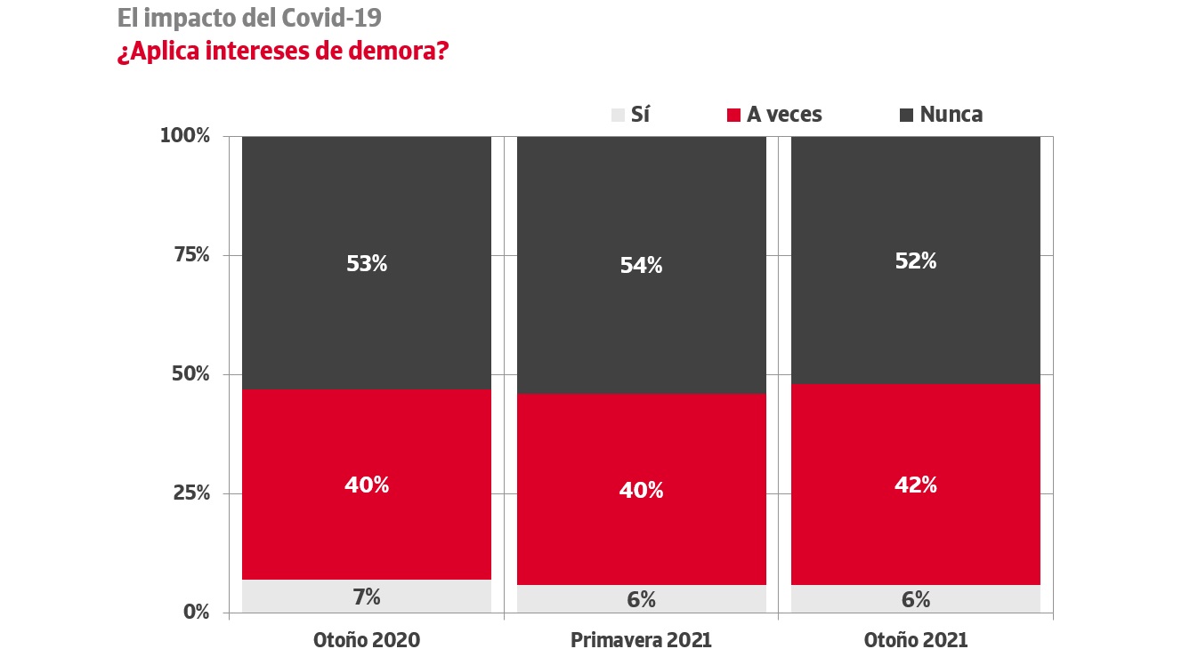 La Ley 3/2004, de 29 de diciembre, por la que se establecen medidas de lucha contra la morosidad en las operaciones comerciales, reconoce el derecho a los proveedores a reclamar intereses de demora si los clientes retrasan el pago de sus facturas. Sin embargo, a lo largo de la pandemia el porcentaje de empresas que renuncia totalmente a la aplicación de estos intereses se ha mantenido por encima del 50%. Solo el 6% de las empresas es sistemático a la hora de ejercer su derecho.