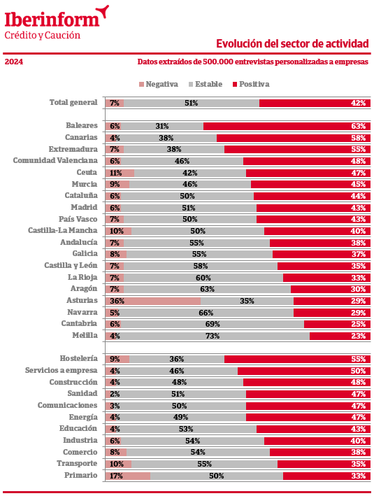 A pesar de la incertidumbre sobre la evolución de 2024, solo el 7% de las empresas, dos puntos menos que en 2023, prevé una evolución negativa de su sector de actividad. El 42% espera crecimientos de la facturación sectorial y un 51% trabaja con un escenario de estabilidad. El dato procede del amplio trabajo de campo anual realizado por Iberinform para enriquecer la calidad de su información, con cerca de 500.000 entrevistas realizadas a los equipos gestores de las empresas españolas.