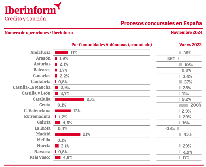 La concursalidad empresarial se concentra en Cataluña (25% del total), Madrid (21%), la Comunidad Valenciana (13%) y Andalucía (11%). Los mayores crecimientos en el conjunto de 2024 se han registrado en Ceuta (200%), Asturias (69%), Cantabria (57%), Madrid (45%), y Andalucía (38%). Solo La Rioja (-38%) y Aragón (-26%) registran una mejoría de los niveles de concursalidad.