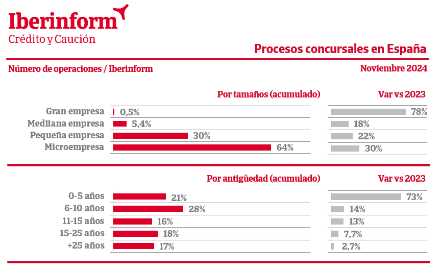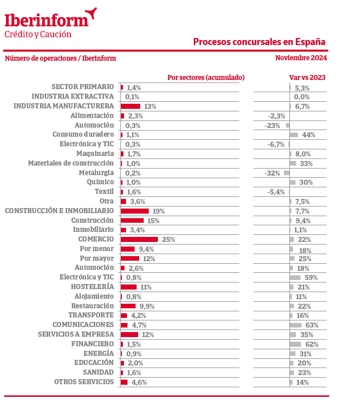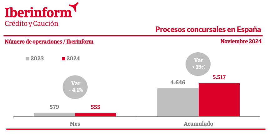De acuerdo con el seguimiento de los procesos concursales publicados en el BOE que realiza Iberinform, el tejido empresarial registró en noviembre una disminución interanual del -4,1% de las insolvencias empresariales. En el conjunto del año acumulan un incremento del 19%.
