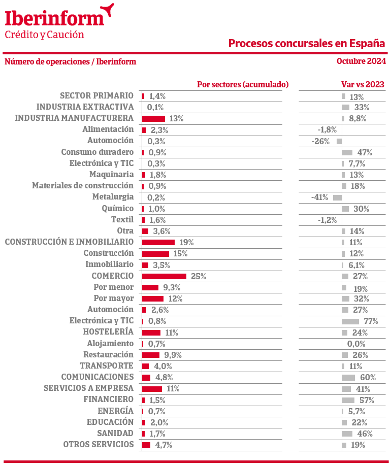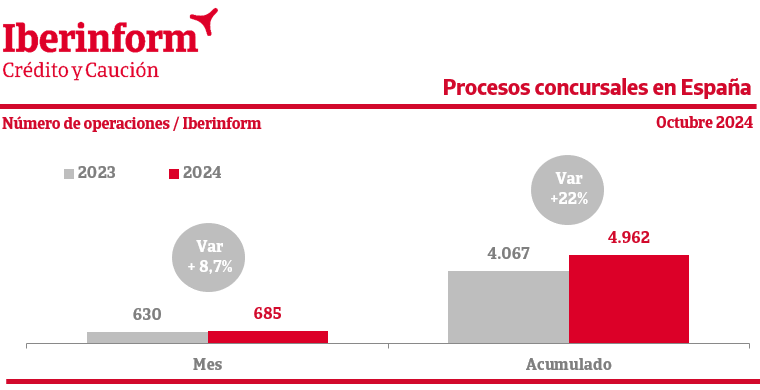 De acuerdo con el seguimiento de los procesos concursales publicados en el BOE que realiza Iberinform, el tejido empresarial registró en octubre un aumento interanual del 8,7% de las insolvencias empresariales. En el conjunto del año acumulan un incremento del 22%.