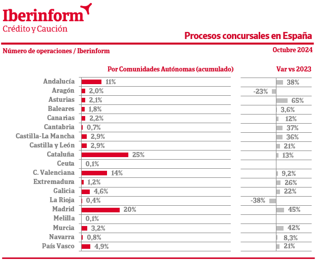 La concursalidad empresarial se concentra en Cataluña (25% del total), Madrid (20%), la Comunidad Valenciana (14%) y Andalucía (11%). Los mayores crecimientos en el conjunto de 2024 se han registrado en las Comunidades Autónomas de Asturias (65%), Madrid (45%), Cantabria (37%) y Castilla-La Mancha (36%). Solo La Rioja (-38%) y Aragón (-23%) registran una mejoría de los niveles de concursalidad.