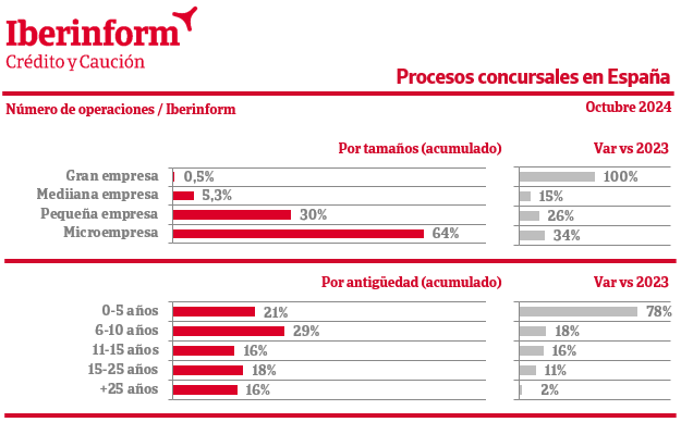 Por tamaño, el incremento de la concursalidad ha crecido un 100% entre las grandes empresas, seguidas por las microempresas (34%). Por antigüedad, las tasas más elevadas de crecimiento se sitúan entre las empresas más recientes, las que no superan los 5 años de vida (78%), siendo muy estables entre las empresas de más de 25 años (2%).