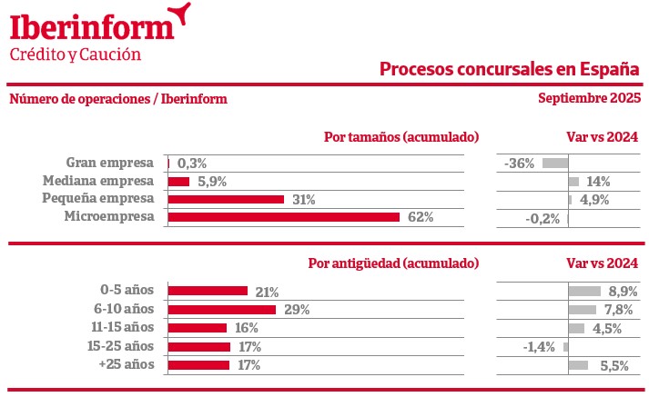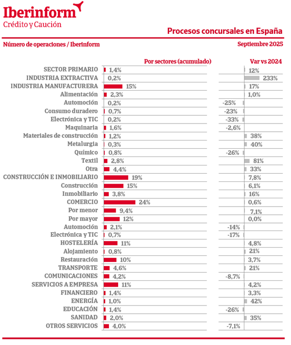Por sectores, hasta septiembre de 2025 predominan las insolvencias en el comercio (24% del total) y en los sectores de construcción e inmobiliario (19%), seguidos de industria manufacturera (15%) y servicios a empresa y hostelería (11%).