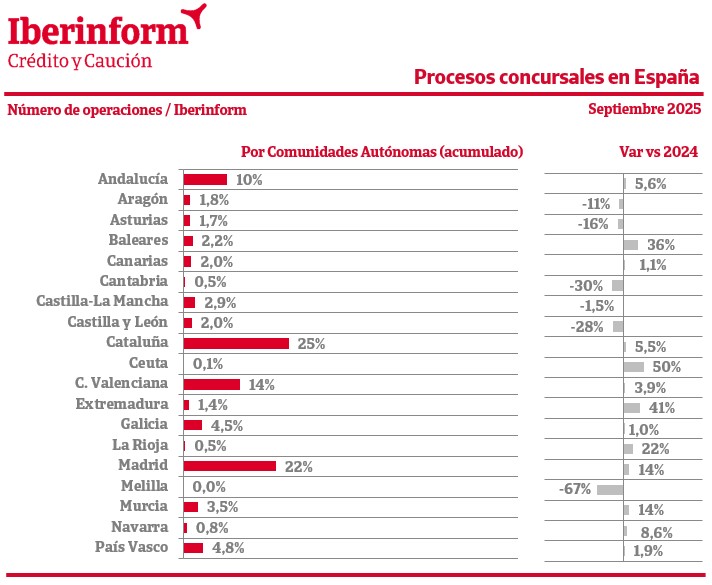 La concursalidad empresarial se concentra en Cataluña (25% del total), Madrid (22%), la Comunidad Valenciana (14%) y Andalucía (10%). Los mayores crecimientos en el conjunto de 2025 con respecto al año anterior se han registrado en Ceuta (50%), Extremadura (41%), Baleares (36%) y La Rioja (22%). La concursalidad registra las mayores mejorías en Melilla (-67%), Cantabria (-30%), Castilla y León (-28%) y Asturias (-16%).