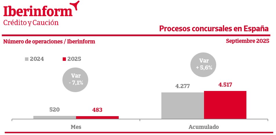 De acuerdo con el seguimiento de los procesos concursales publicados en el BOE que realiza Iberinform, el tejido empresarial registró en septiembre una bajada interanual del 7,1% de las insolvencias empresariales. En el conjunto del año, acumulan un incremento del 5,6% con respecto al mismo periodo de 2024.