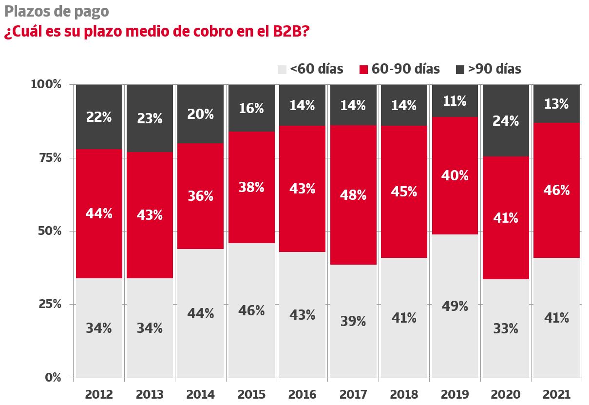 En la oleada de otoño ya se observó una mejora sustancial de los plazos, que se mantiene en 2021. De acuerdo con el estudio, en el que han participado cerca de 700 gestores de empresas de todos los tamaños y sectores, un 13% del tejido productivo trabaja por encima de los 90 días, solo dos puntos por encima de los valores de 2019. El 49% de las empresas opera con plazos superiores a los 60 días que trató de impulsar la Ley 15/2010 de Medidas de Lucha contra la Morosidad, nueve puntos más que en 2019.