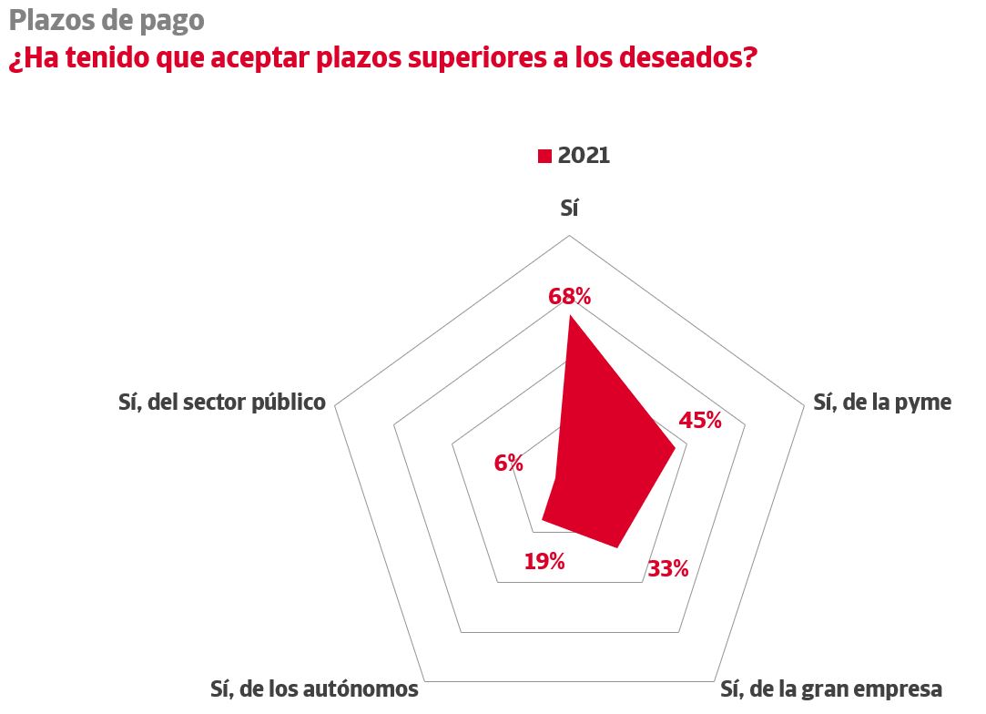 El 68% de las empresas tiene que aceptar plazos de pago superiores a los deseados para poder mantener su cartera de clientes. El mejor comportamiento se registra en el sector público y el peor entre las pymes. Solo el 6% de las empresas que tiene relaciones comerciales con la Administración tiene que aceptar una extensión indeseada de los plazos de pago, un porcentaje similar a 2019. La capacidad de los autónomos para imponer plazos de pago también se mantiene estable, en el 19%.