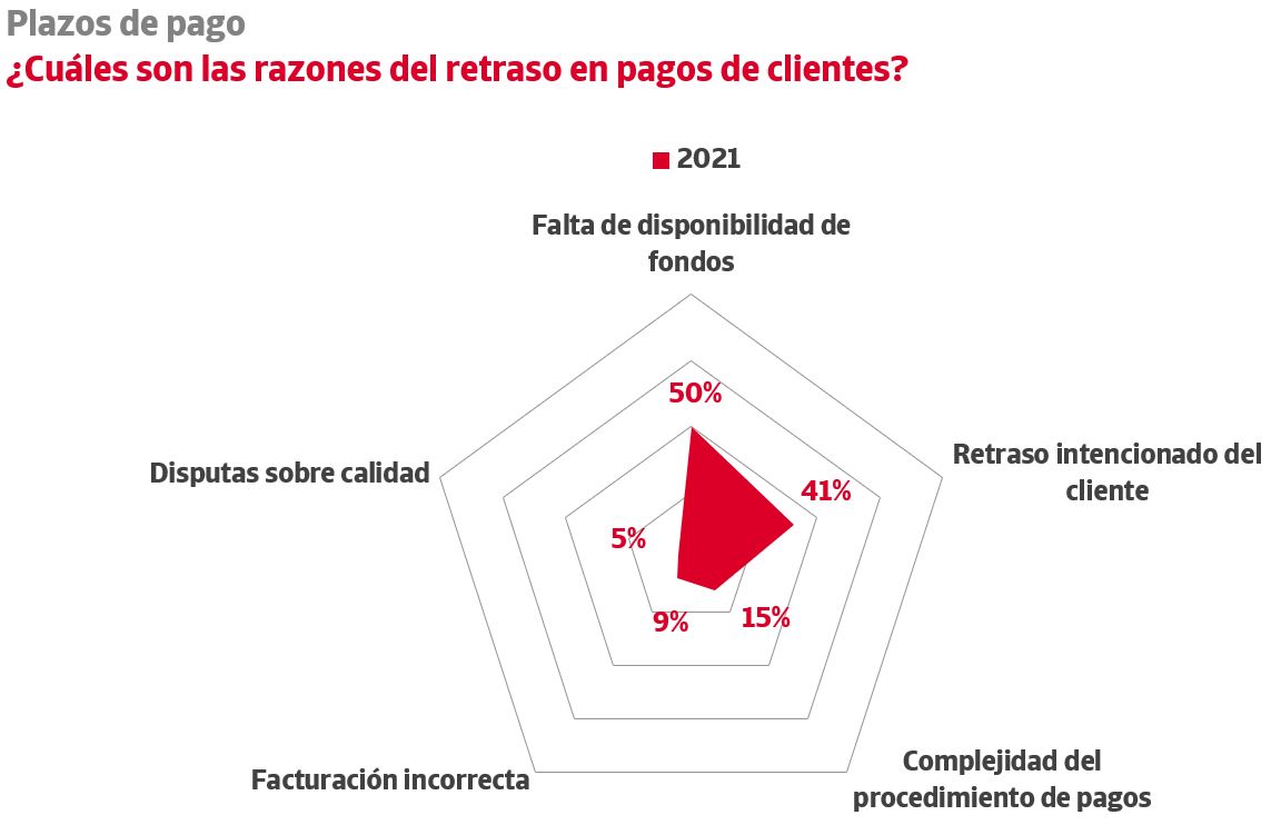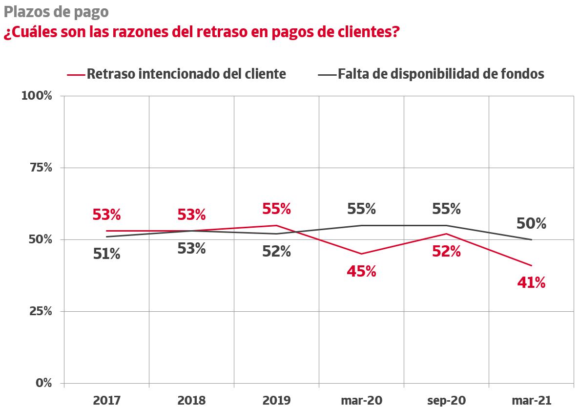 Al abordar las razones que explican la morosidad empresarial, la falta de disponibilidad de fondos (50%) es la razón más citada en las tres oleadas realizadas durante la pandemia, por primera vez desde 2016, por delante del retraso intencionado de los clientes (41%). La complejidad del procedimiento de pagos (15%), la emisión de facturas incorrectas (9%) o las disputas sobre la calidad de los bienes y servicios suministrados (5%) completan las motivaciones esgrimidas por los clientes para retrasar sus pagos.
