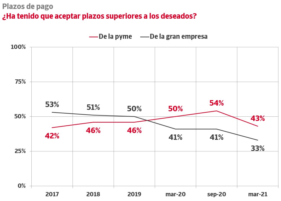 En el caso de las grandes empresas, se trata del menor porcentaje de la serie histórica, lo que implica un esfuerzo durante la crisis por no agravar las tensiones de liquidez entre sus proveedores. En el caso de las pymes, se observa un claro empeoramiento en las dos primeras oleadas de la pandemia, un síntoma del intento de trasladar a través de la cadena de valor los problemas de tesorería que está generando la pandemia en este segmento. En la última oleada, sin embargo, se observa una mejora de su comportamiento.