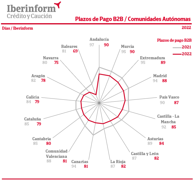 Por comunidades autónomas, la evolución del comportamiento en pagos depende de diversos condicionantes entre los que cabe citar, principalmente, dos: los matices en la cultura de pagos o la composición sectorial. La horquilla supone 21 días adicionales de crédito comercial. Baleares, Navarra, Aragón, Galicia, Cataluña, Cantabria, Comunidad Valenciana, Canarias, La Rioja y Castilla y León presentan los plazos de pago más reducidos de todo el Estado. En el otro extremo, por encima de la media se sitúan Andalucía, Murcia, Extremadura, Madrid, País Vasco, Castilla-La Mancha y Asturias. Todas las comunidades autónomas vuelven a situarse por debajo de los cien días. La reducción de los plazos de pago se produce en todas ellas.