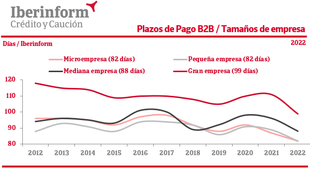 Los plazos de pago en las relaciones comerciales entre empresas se han reducido de forma generalizada en todos los segmentos empresariales durante 2022. Se registra una caída de doce días entre las grandes empresas, que son las que presentan los plazos más prolongados. Las pequeñas y las medianas empresas registran una redución de ocho y siete días, respectivamente, en sus plazos de pago. En el caso de la microempresa, este recorte alcanza los cinco días. De hecho las microempresas presentan plazos similares a las pequeñas, 82 días. Las medianas se sitúan en 88 días y las grandes, por primera vez en la serie histórica, se encuentran por debajo de los cien días.