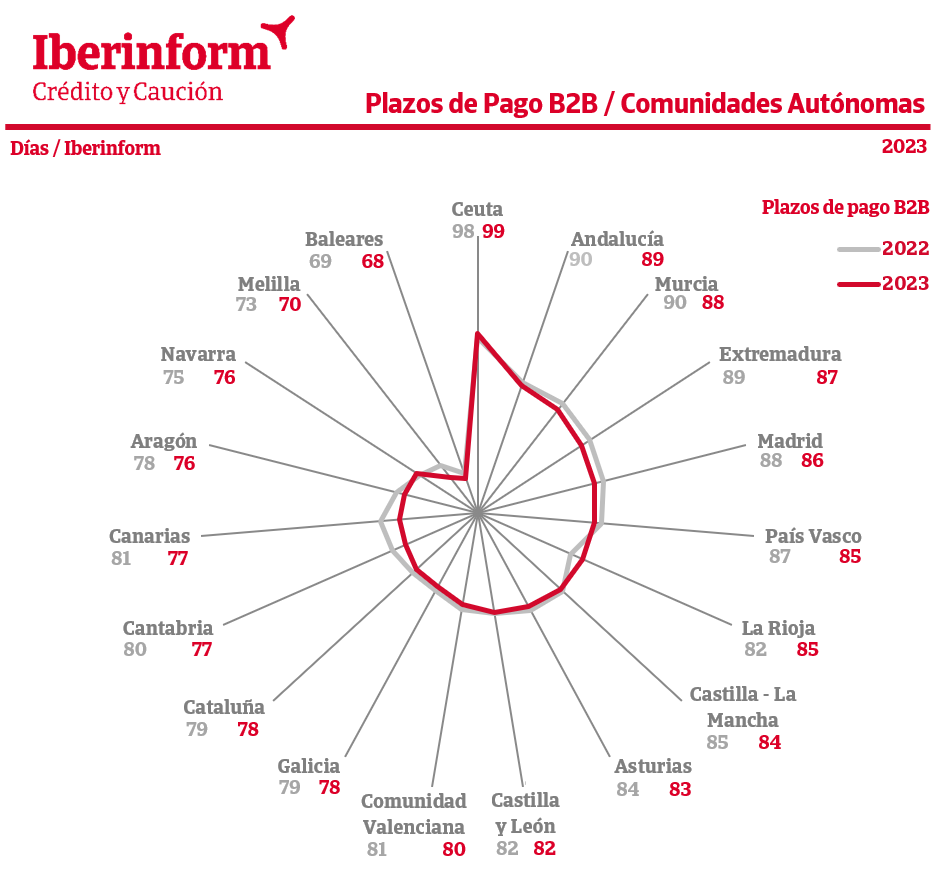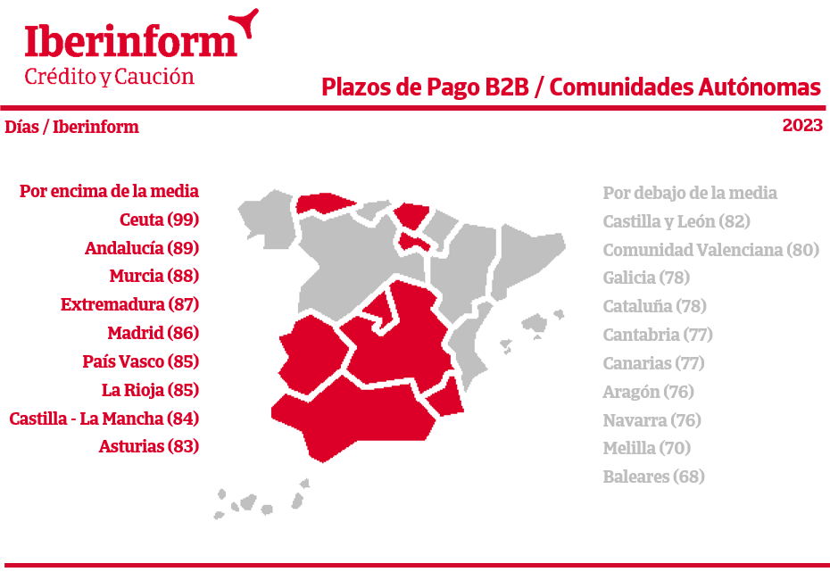 Por comunidades autónomas, la evolución del comportamiento en pagos depende de diversos condicionantes entre los que cabe citar, principalmente, dos: los matices en la cultura de pagos o la composición sectorial. La horquilla supone 31 días adicionales de crédito comercial. Baleares, Melilla, Navarra, Aragón, Canarias, Cantabria, Cataluña, Galicia, Comunidad Valenciana, y Castilla y León presentan los plazos de pago más reducidos de todo el Estado. En el otro extremo, por encima de la media se sitúan Ceuta, Andalucía, Murcia, Extremadura, Madrid, País Vasco, La Rioja, Castilla-La Mancha y Asturias. Todas las comunidades y ciudades autónomas vuelven a situarse por debajo de los cien días. Solo La Rioja, Navarra y Ceuta registran empeoramientos de los plazos de pago.