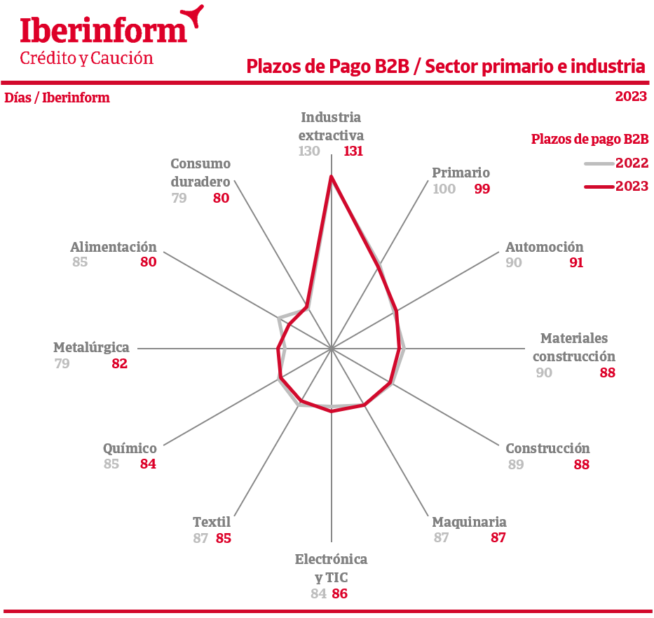 Ninguno de los sectores productivos logra situarse por debajo de los 60 días. Los plazos de pago en el sector primario se sitúan en 99 días. En los distintos sectores industriales los plazos de pago muestran una amplia horquilla. Los peores se registran en la industria extractiva (131 días), seguida de automoción (91), materiales de construcción (88), construcción (88), maquinaria (87), electrónica y TIC (86), textil (85), químico (84) y metalurgia (82 días). Solo se sitúan por debajo de la media alimentación (80) y consumo duradero (80). La mayor reducción se registra en alimentación (5 días).