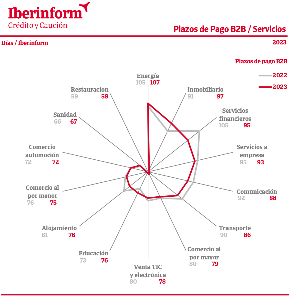Entre los servicios, los peores plazos de pago se producen en energía (107 días), inmobiliario (97), servicios financieros (95), servicios a empresa (93), comunicaciones (88), y transporte (86). Se sitúan por debajo de la media comercio al por mayor (79), comercio de electrónica y TIC (78), educación (76), alojamiento (76 días), comercio al por menor (75), comercio de automoción (72), sanidad (67) y restauración (58). Las mayores reducciones se registran en servicios financieros (10 días), alojamiento (5), comunicaciones (4) y transporte (4).