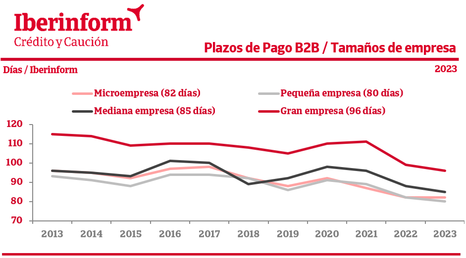 Los plazos de pago en las relaciones comerciales entre empresas se han reducido de forma generalizada en la mayoría de los segmentos empresariales durante 2023. Se registra una caída de tres días entre las grandes empresas, que son las que presentan los plazos más prolongados. Las medianas y las pequeñas empresas registran una reducción de tres y dos días, respectivamente, en sus plazos de pago. La microempresa es el único caso donde se mantienen estables. De hecho las microempresas presentan plazos dos días superiores a las pequeñas. Las medianas se sitúan en 85 días y las grandes, por segundo año consecutivo, se encuentran por debajo de los cien días.