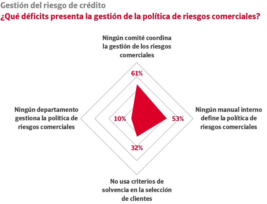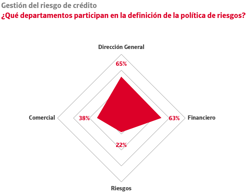 Frente a este crecimiento del papel del primer ejecutivo como último decisor, la existencia de unidades de riesgos sigue registrando valores mínimos: solo el 22% de las empresas cuenta con áreas especializadas en la gestión del riesgo de crédito comercial. A diferencia de la crisis económica de hace una década, no se está registrando un incremento en la creación de estos departamentos específicos para gestionar la morosidad de la cartera de clientes. El peso de la gestión técnica de la política de riesgos comerciales sigue recayendo, como una tarea más, en los departamentos financieros (63% de las empresas), en ocasiones en coordinación con las direcciones comerciales (38% de las empresas) que gestionan directamente la cartera de clientes y la búsqueda de ventas en el mercado potencial.